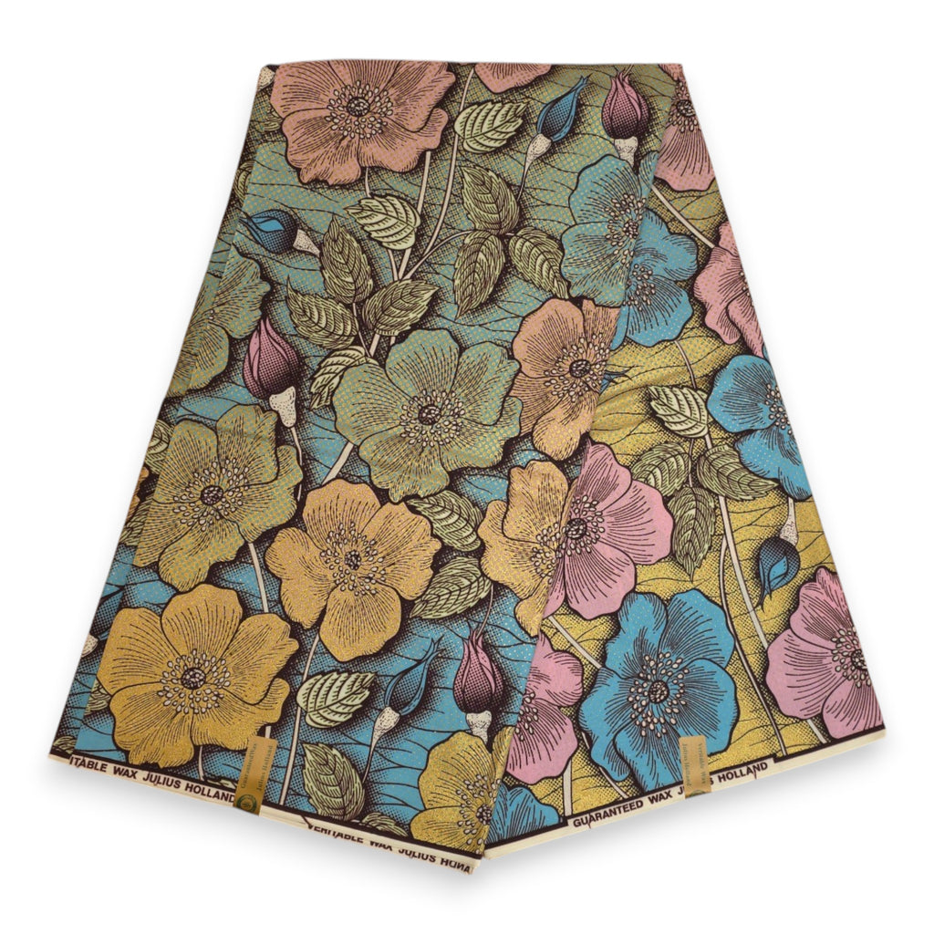 Tela estampada Wax africana - Azul Oro Vintage Garden Bloom - Efecto especial Brillante Edición Platino